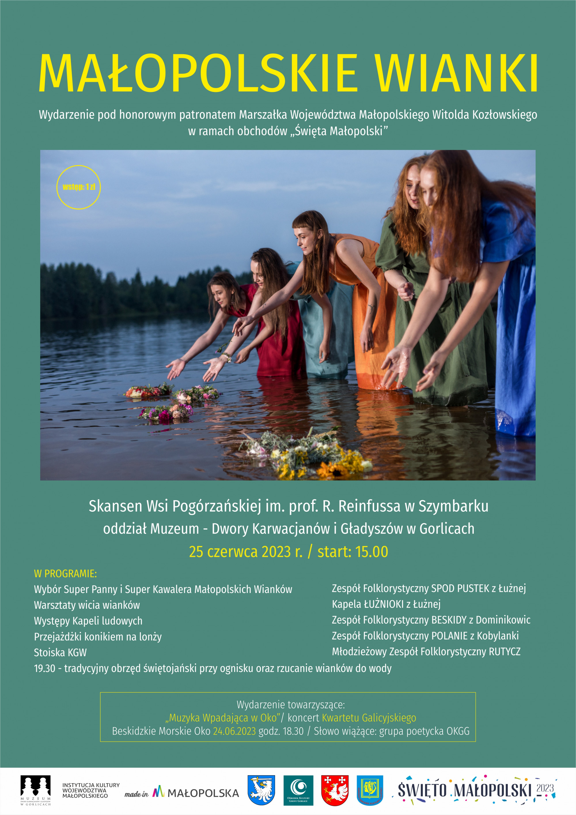 Muzeum Dwory Karwacjanów i Gładyszów w Gorlicach serdecznie zaprasza na Małopolskie Wianki, które odbędą się 25.06.2023 w Skansenie Wsi Pogórzańskiej w Szymbarku, pod honorowym patronatem Marszałka Województwa Małopolskiego Witolda Kozłowskiego.