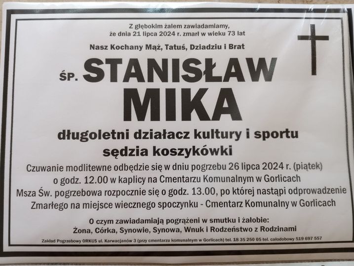 21 lipca 2024 r. zmarł Stanisław Mika - długoletni działacz kultury i sportu, sędzia koszykówki.