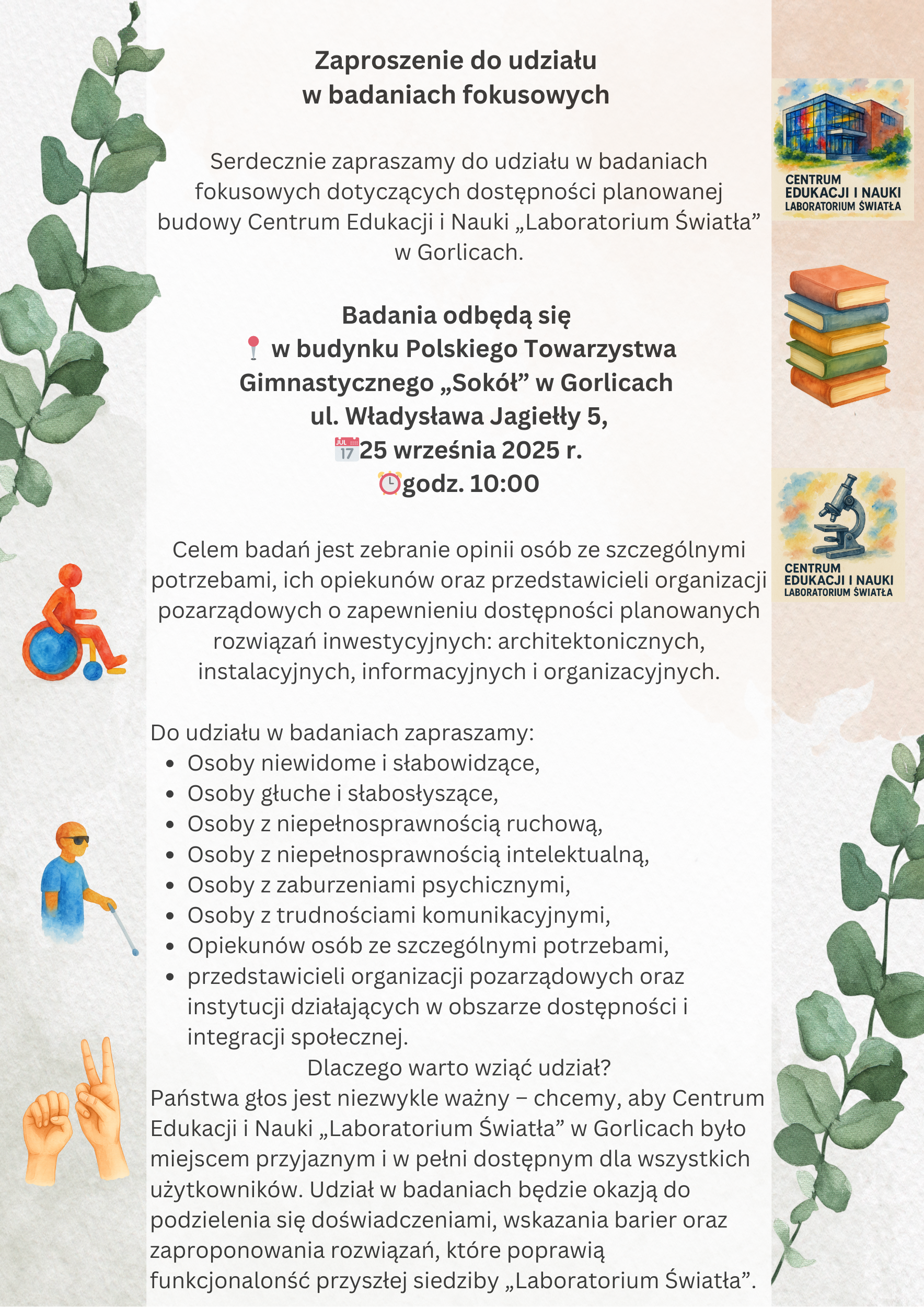 Zapraszamy do udziału w badaniach fokusowych dotyczących dostępności planowanej budowy Centrum Edukacji i Nauki „Laboratorium Światła” w Gorlicach.