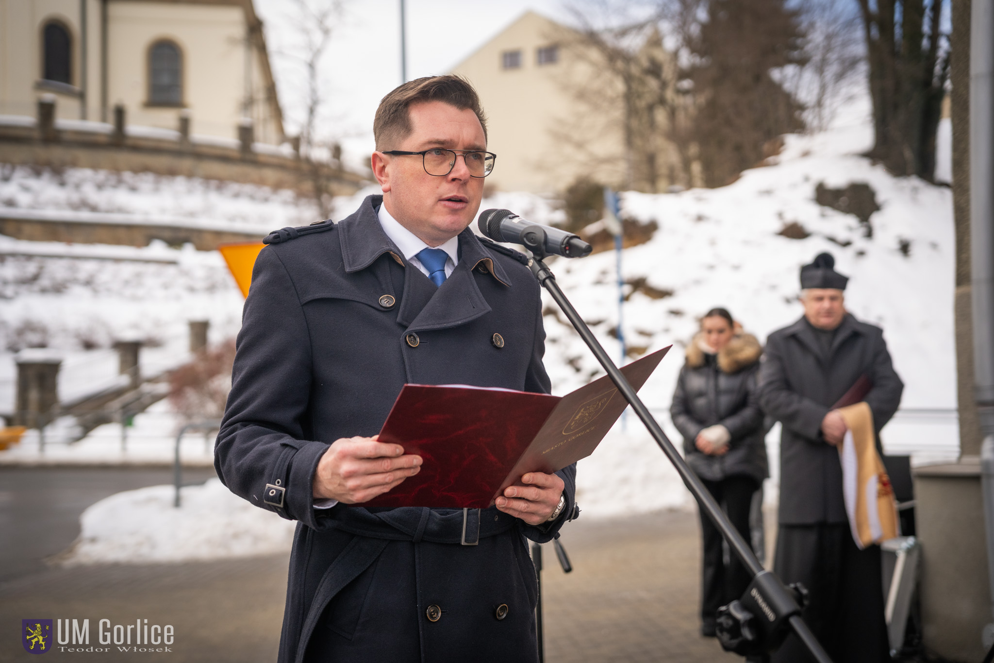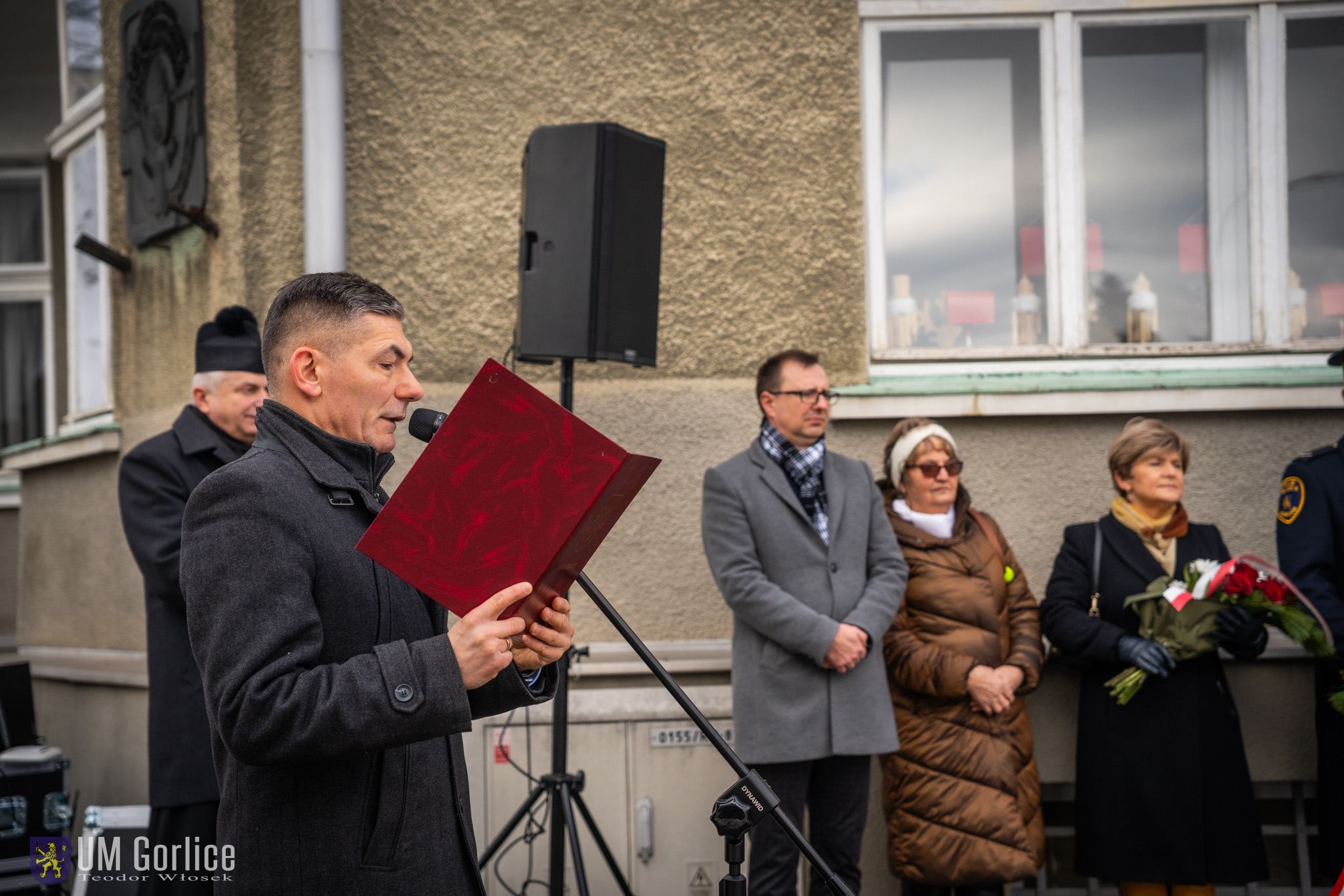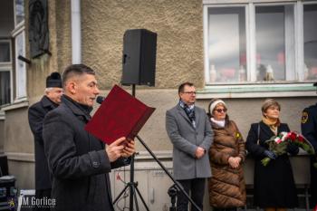 „W czasie II wojny światowej ludność Gorlic była świadkiem i ofiarą nieopisanych okrucieństw – egzekucji, deportacji, prześladowań. Z rąk najeźdźców życie straciły tysiące mieszkańców, a społeczność gorlickich Żydów została niemal całkowicie zgładzona. Brutalne represje i masowy terror stały się codziennością: łapanki, aresztowania, rabunki siały strach i rozpacz. W budynku, przed którym dziś stoimy, mieściła się lokalna siedziba Gestapo – symbolu brutalności i narzucania społecznej kontroli.” – mówił Zastępca Burmistrza Miasta Gorlice Sebastian Puchajda.