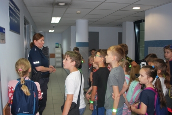 5. Pieszą wycieczkę o charakterze profilaktycznym „Bezpieczne wakacje” do Komendy Powiatowej Policji w Gorlicach, podczas której p. Karolina Gurba opowiedziała dzieciom jak unikać niebezpiecznych zachowań w czasie wakacyjnych zabaw, a także oprowadziła nas po całym obiekcie komendy.
