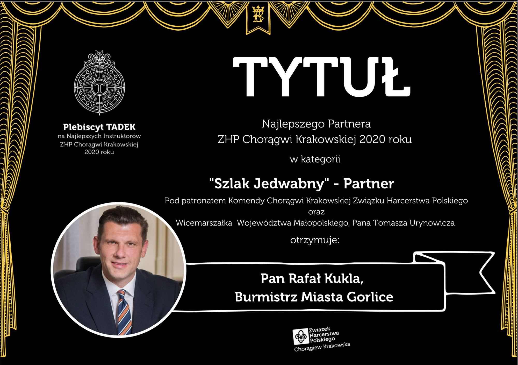 Małopolscy Harcerze docenili aktywny udział, pomoc oraz zaangażowanie włodarza naszego miasta w życie społeczne Gorlic i działających tu organizacji, w tym gorlickiego Hufca ZHP przyznając nagrodę w kategorii "Szlak Jedwabny - Partner".