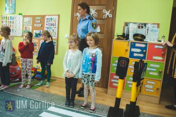 Dzieci dowiedziały się czym zajmuje się straż miejska oraz miały możliwość obejrzeć z bliska wyposażenie oraz umundurowanie strażników takie jak: kajdanki, radiostacje, tarcze do zatrzymywania pojazdów. Funkcjonariusze prowadzący zajęcia prezentowali różne sytuacje drogowe. Dzieci rozpoznawały znaki, uczyły się i utrwalały zasady bezpiecznego przejścia przez jezdnię, poruszania się na chodniku, przestrzegania kolorów sygnalizacji świetlnej.