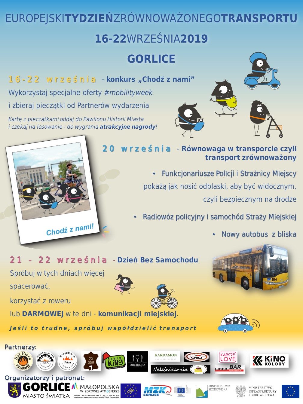 Konkurs z nagrodami, darmowa komunikacja miejska, prezentacja radiowozu policyjnego i samochodu Straży Miejskiej, możliwość odebrania modnych odblasków i akcesoriów rowerowych - to czeka nas w ramach kolejnej edycji "Europejskiego Tygodnia Zrównoważonego Transportu", który w Gorlicach obchodzić będziemy już po raz trzeci. Tydzień wydarzeń opiera się o tegoroczne hasło akcji „Chodź z nami!”, czyli stawiamy na spacery - dlatego przez cały tydzień można korzystać ze specjalnej, limitowanej na ten czas oferty u Partnerów naszego wydarzenia !